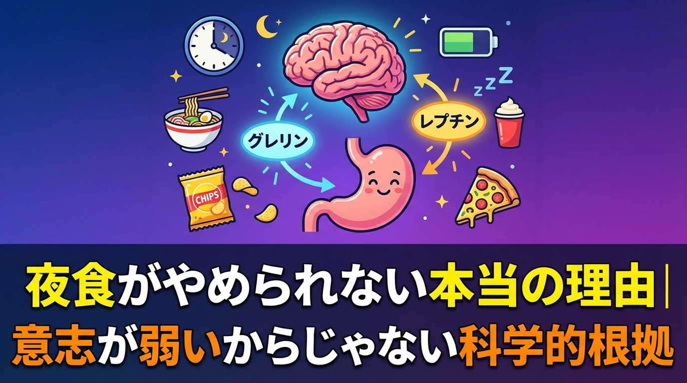 夜食がやめられないのは、あなたの身体で起きている3つの科学的なメカニズムが原因なんです。意志力とは全く関係ない。むしろ、これを知らないまま根性で頑張ろうとすると、余計に夜食が増えちゃいます(笑)