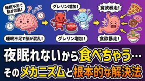 睡眠の質が低下すると、自律神経のバランスが崩れ、特に夜に食欲が止まらなくなるという現象が起きます。これが「夜食症候群」と呼ばれる状態です。